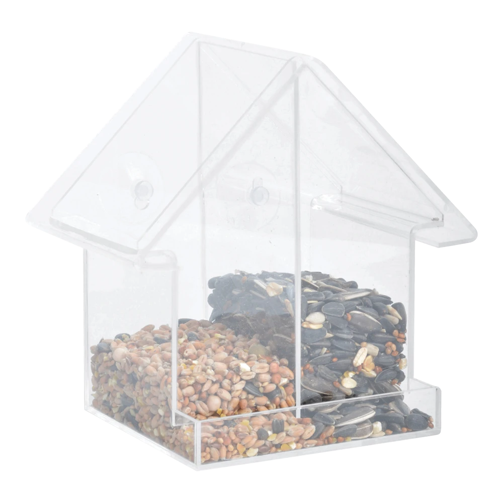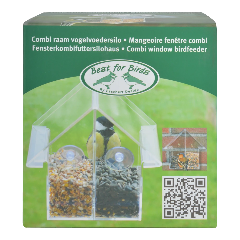 Een raamsilo voor het voeren van tuinvogels. Ophangbaar aan de raam met zuignoppen.