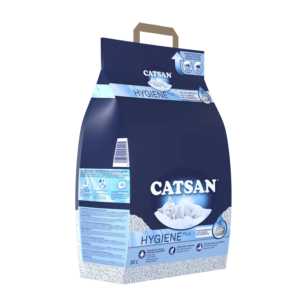 – CATSAN® hygiene plus bestaat uit fijne mineraalkorrels vervaardigd uit kalk en kwartszand die het vocht absorberen als een spons. Deze unieke mineraalkorrels voorkomen de vorming van geurtjes effectiever dan standaard kattenbakvullingen.