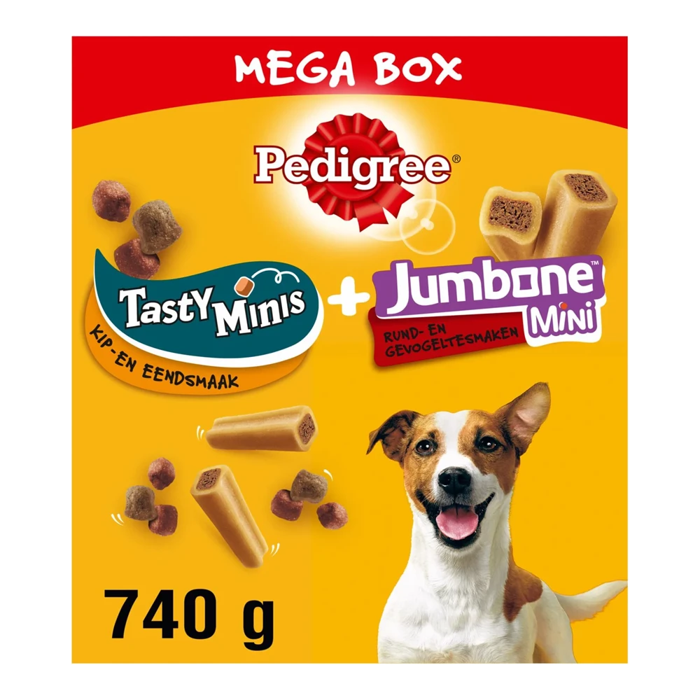 Pedigree Tasty Mini’s Hondensnacks met kip- en eendsmaak zijn sappige, hapklare tussendoortjes met verschillende texturen en smaken. Ideaal om je hond te trainen, te belonen of gewoonweg te verwennen. Pedigree Jumbone Mini met rund- en gevogeltesmaken is een heerlijke kauwstaaf die een stevige, malse buitenkant combineert met een sappige, smaakvolle kern.