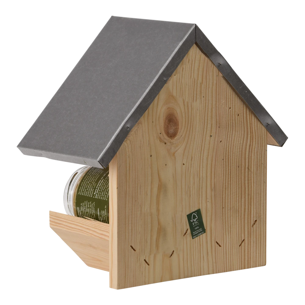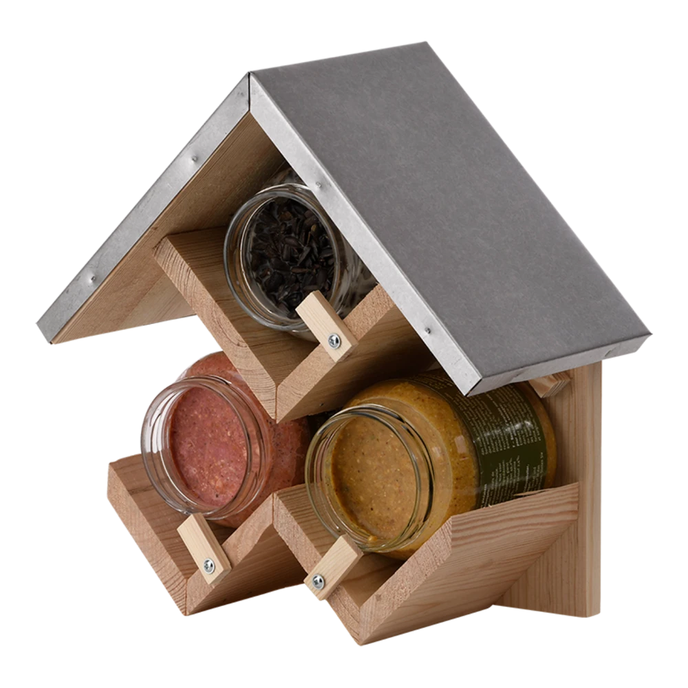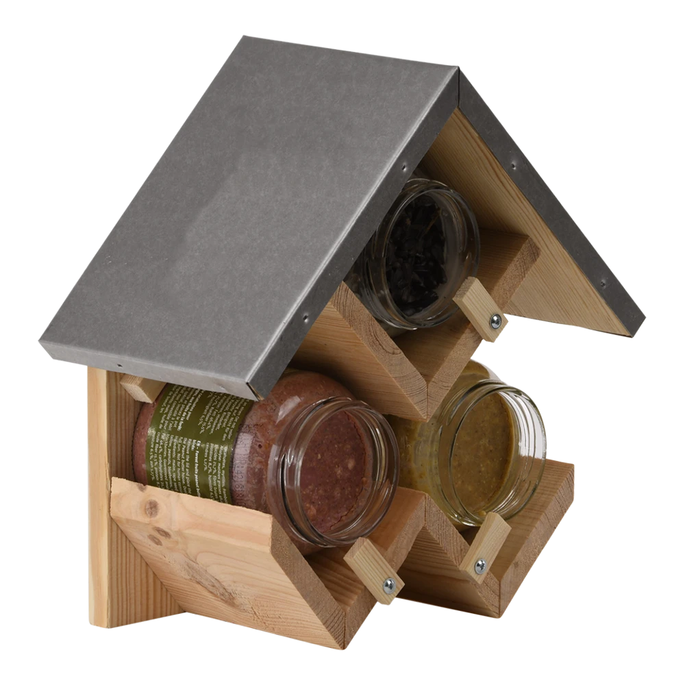 Verwen de vogels in de tuin met speciale vogelpindakaas. Dit pindakaashuis biedt plek aan drie soorten pindakaas, voor ieder wat wils.