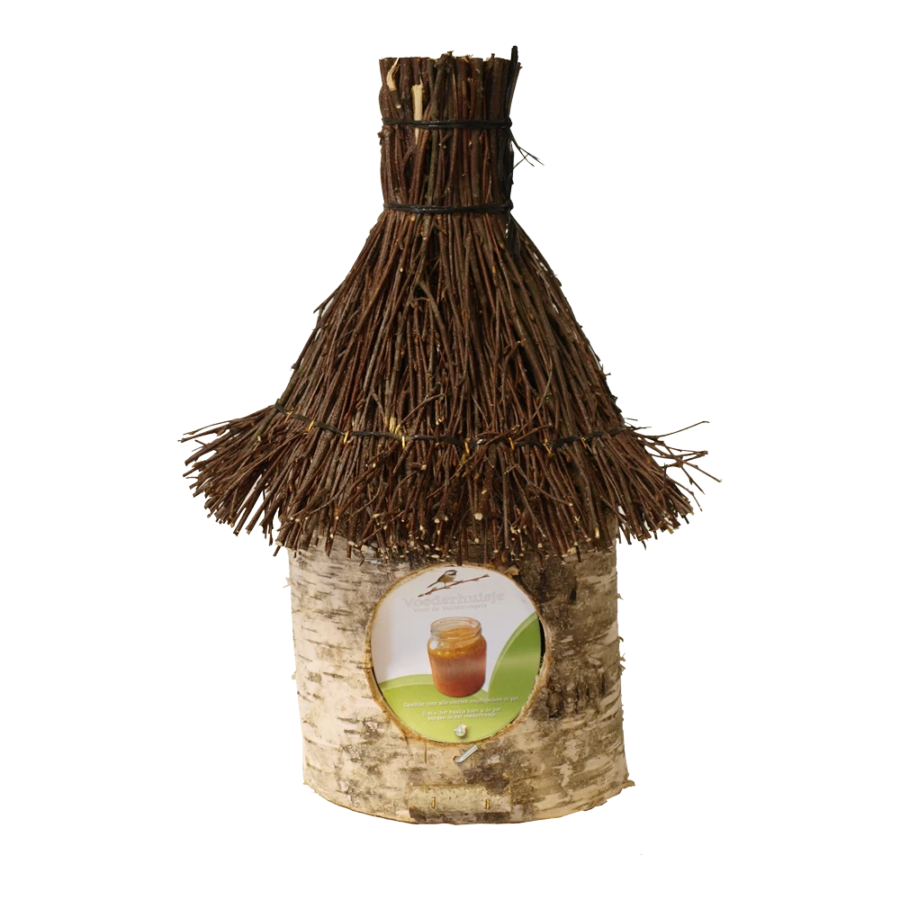 Pindakaaspot houder berken met tenen dak. Een pot vogelpindakaas voor buitenvogels kan u heel gemakkelijk ophangen met deze berken pindakaaspothouder. Deze pindakaaspothouder is verkrijgbaar met een berken, tenen of stro dak. Hang de pindakaaspothouder aan een muur, boom of schutting en schuif een pot pindakaas voor vogels (zonder deksel) in de berken houder. Zo creëert u een drukbezochte voederplaats voor veel kleurrijke buitenvogels.