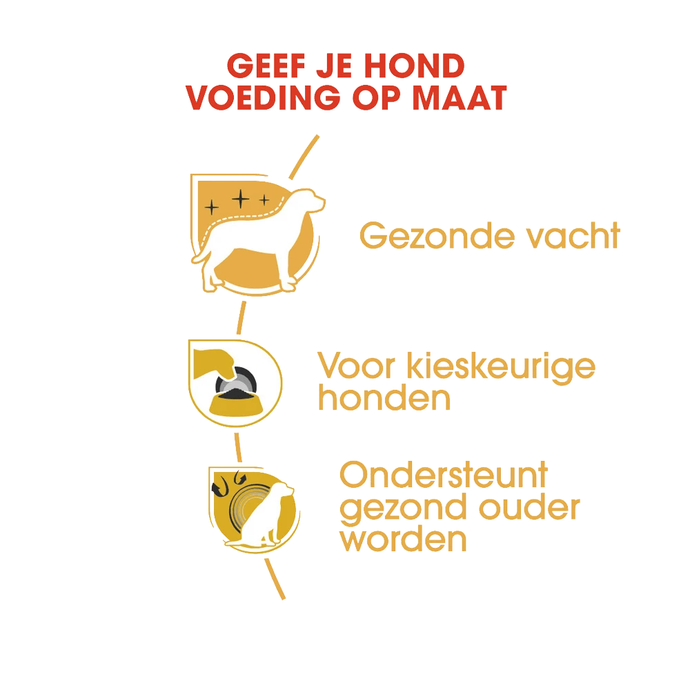 | Beschrijving samenstelling | Samenstelling: gedehydreerde gevogelte-eiwitten, maïsmeel, rijst, dierlijke vetten, isolaat van plantaardige eiwitten*, maïs, maïsgluten, hydrolysaat van dierlijke eiwitten, plantaardige vezels, bietenpulp, mineralen, visolie, sojaolie, Fructo-Oligo-Sacchariden, hydrolysaat van gist (bron van Manno-Oligo-Sacchariden), bernagieolie (0,1%), Tagetes (Afrikaan) extract (bron van luteïne), hydrolysaat van schaaldieren (bron van glucosamine), hydrolysaat van kraakbeen (bron van chondroïtine), gist en delen daarvan *L.I.P.: hoogwaardige eiwitten die zeer goed verteerbaar zijn. |